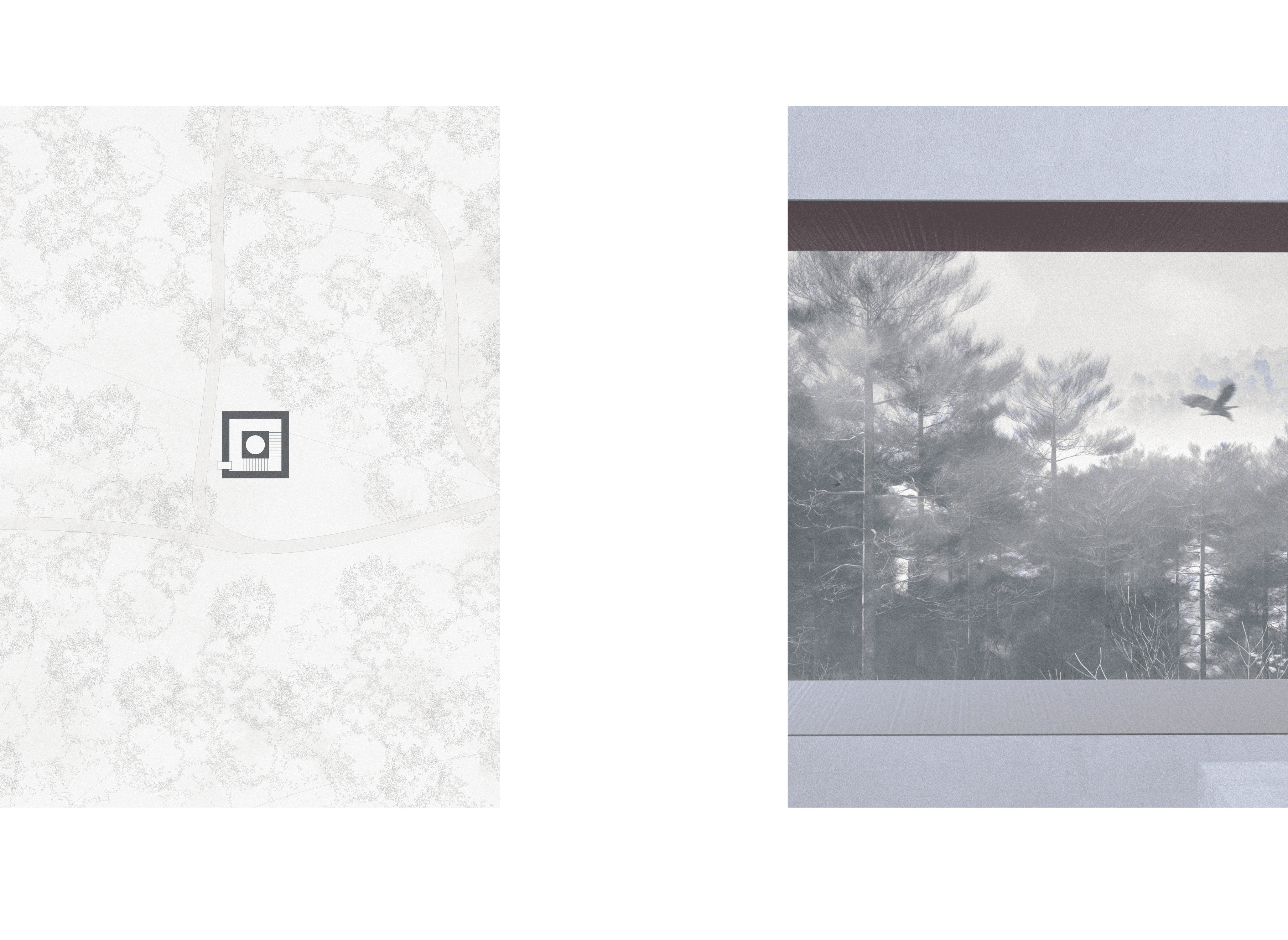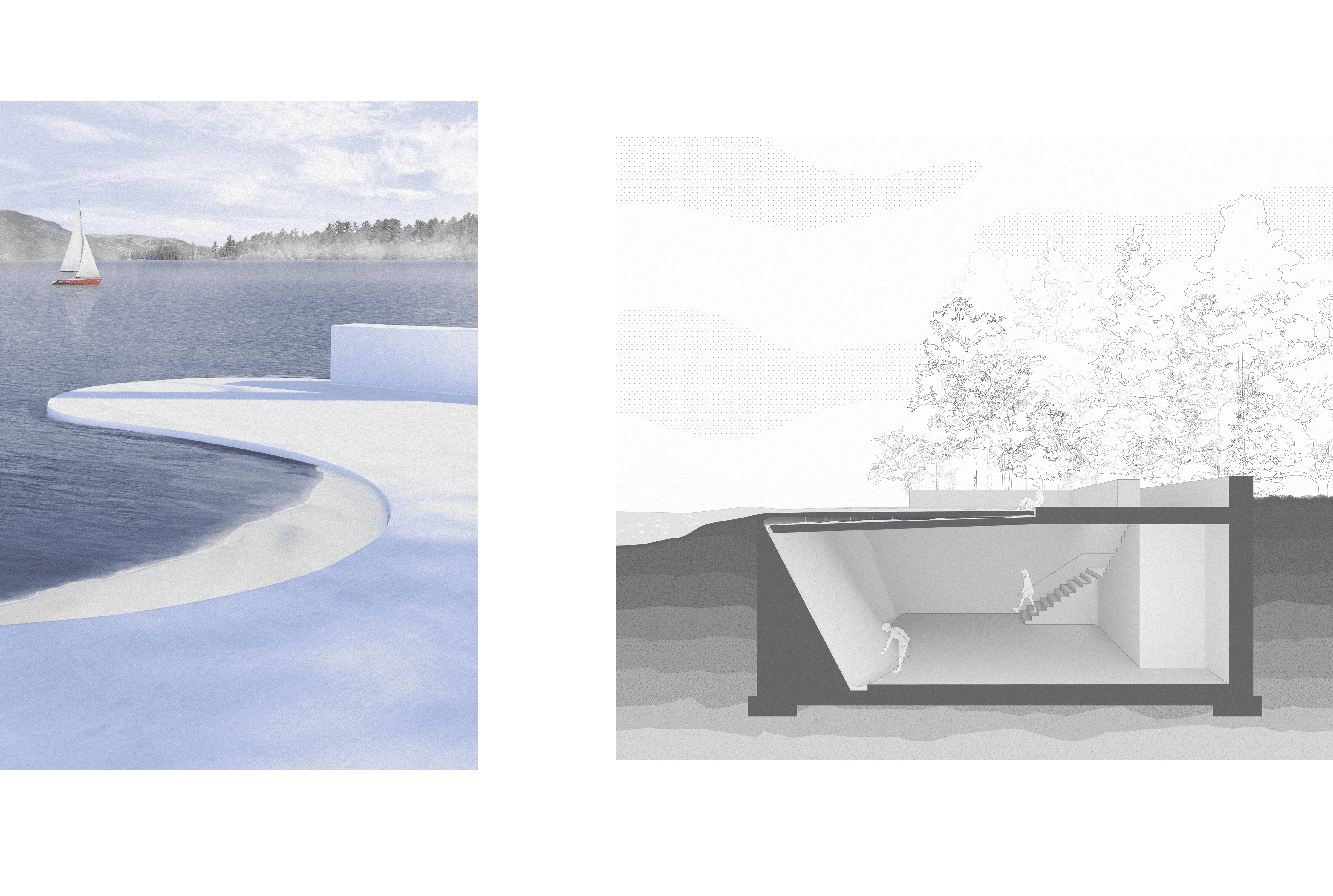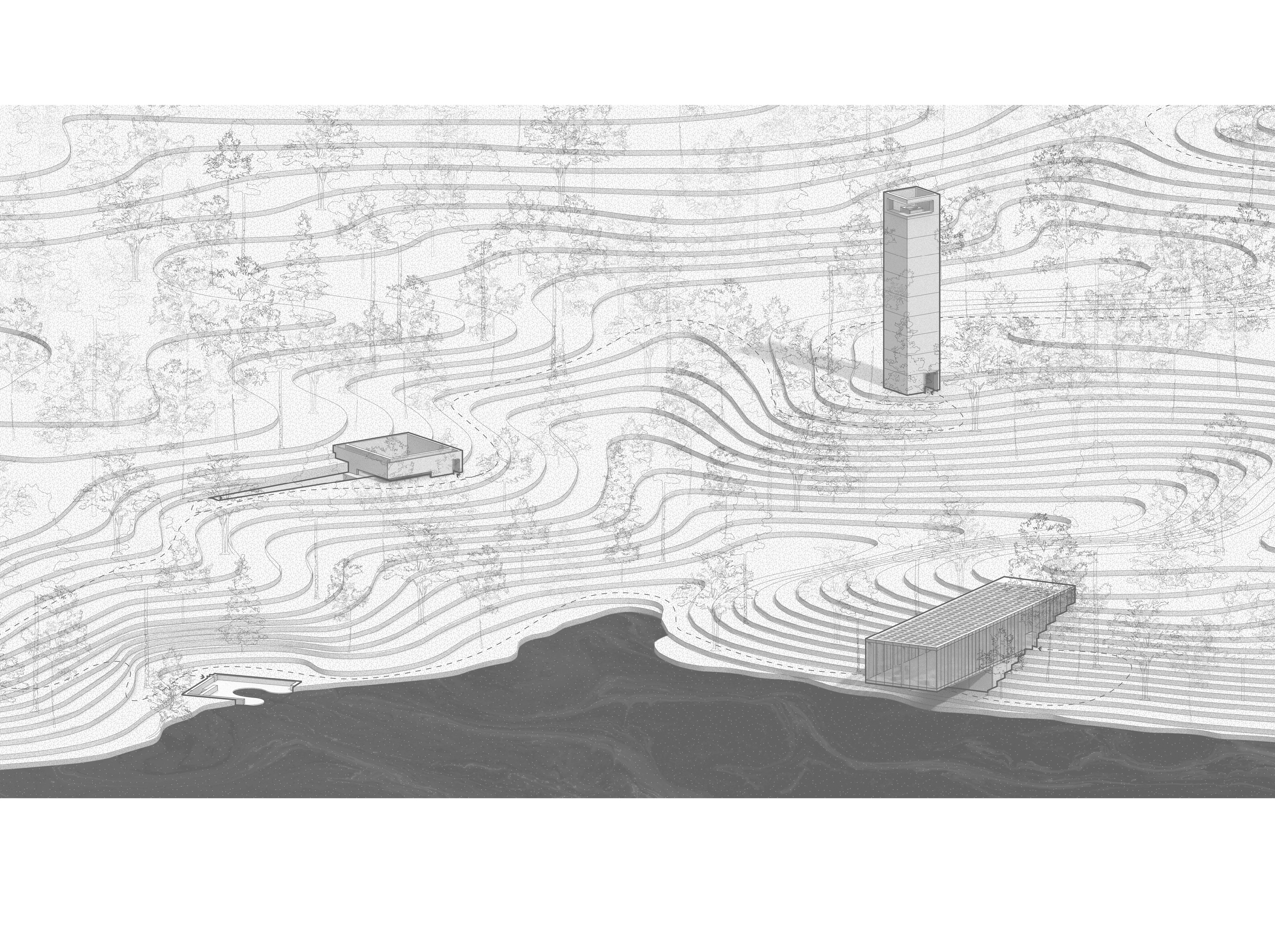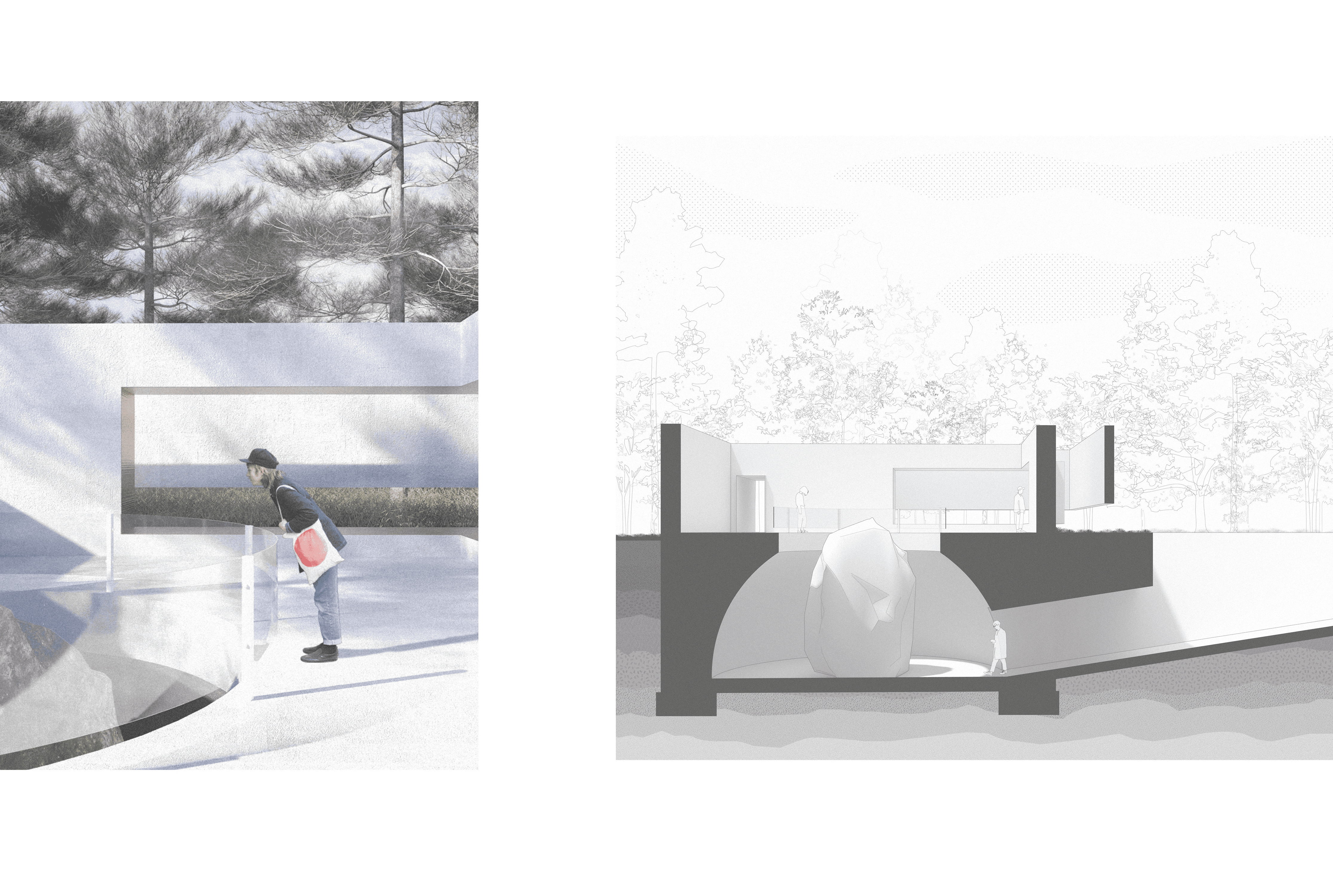 The monuments are dedicated to the three main principles of our environment: air, land, and water. Because of our tendencies to selfishly mistreat and destroy elements of nature for our benefit, each of the three monuments consists of solid, two-foot-thick concrete walls. The paradoxical narrative created by designing monuments dedicated to nature that act as a blank canvas yet still use unnatural materials serves to show that we have still not found a way to design architecture that can resiliently and responsibly withstand nature’s forces while still using materials occurring naturally in our environment. Inside the project’s only ‘building’ sits a cantilevered gallery of some of nature’s most beautiful objects—each of which is behind glass or rope. This furthers the idea that the only time you can truly appreciate nature is when you are outside, not when it is curated.