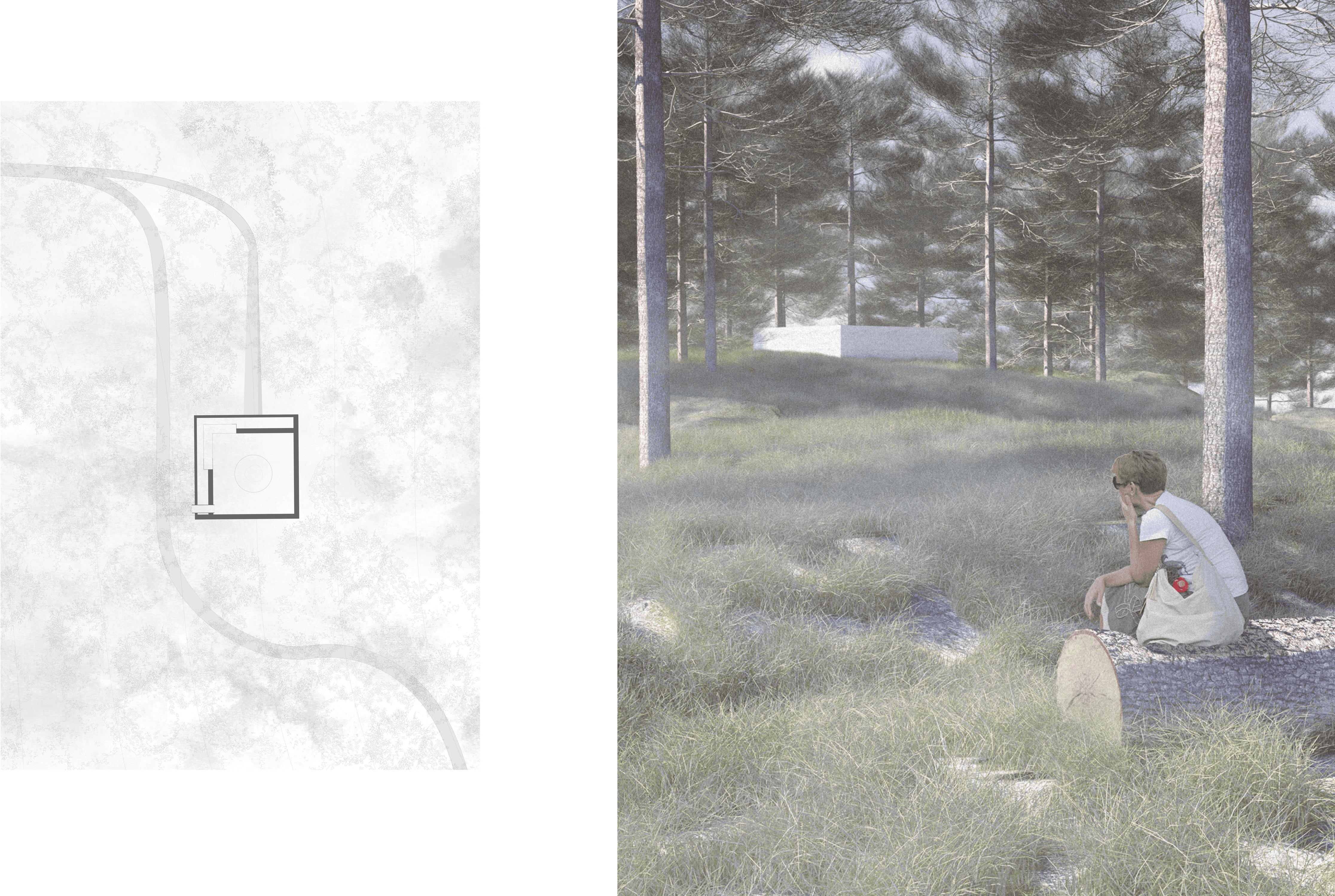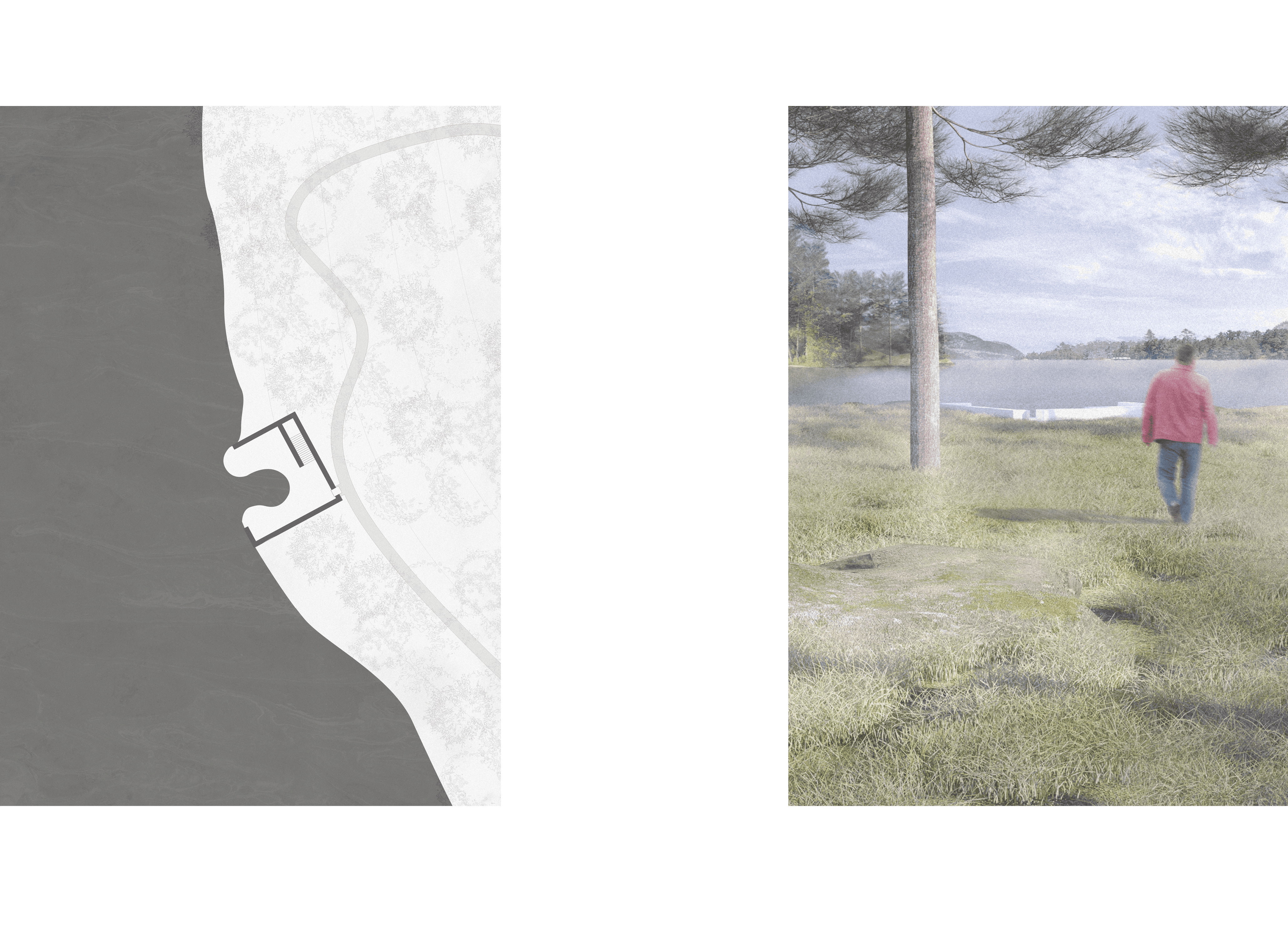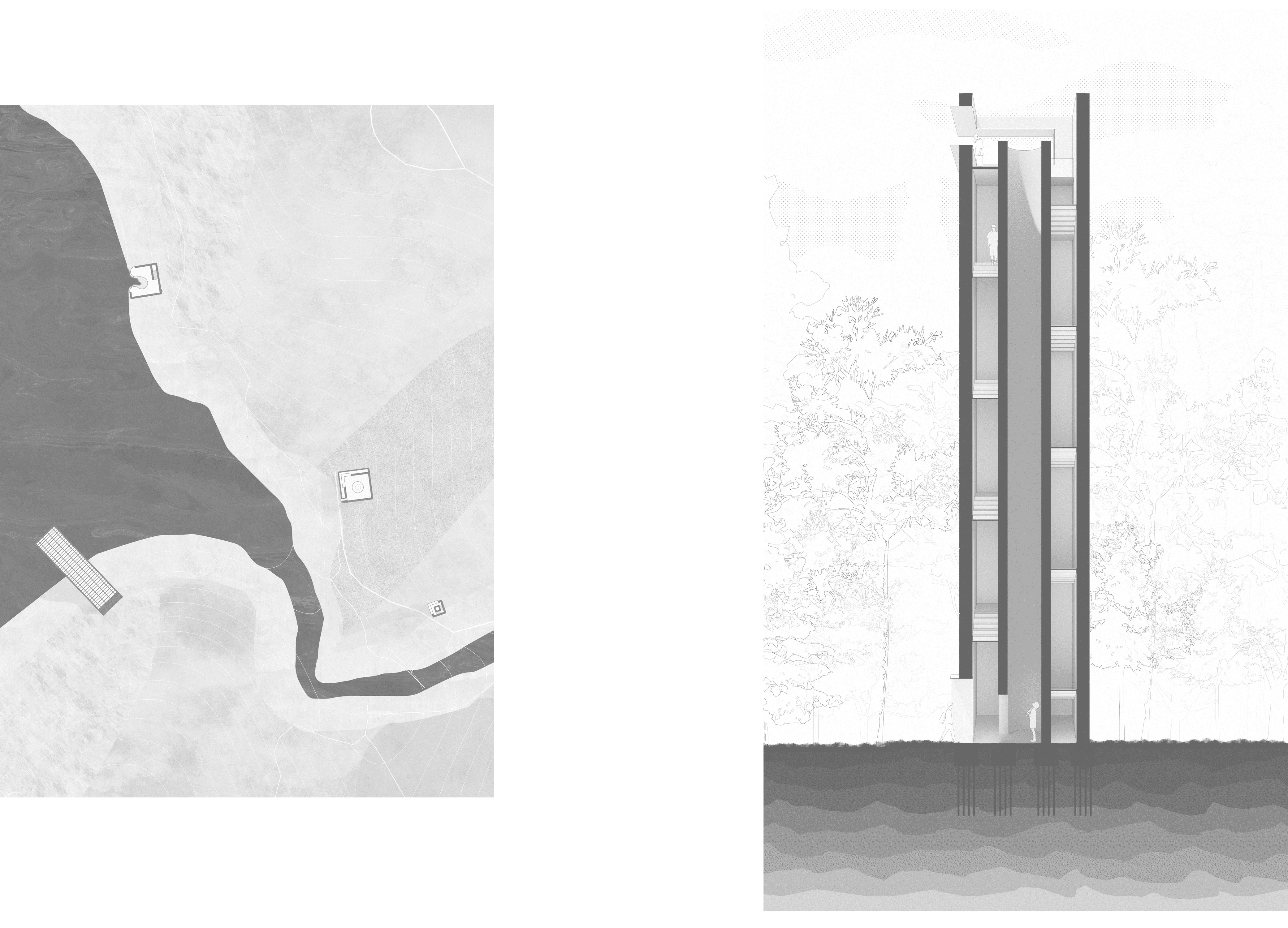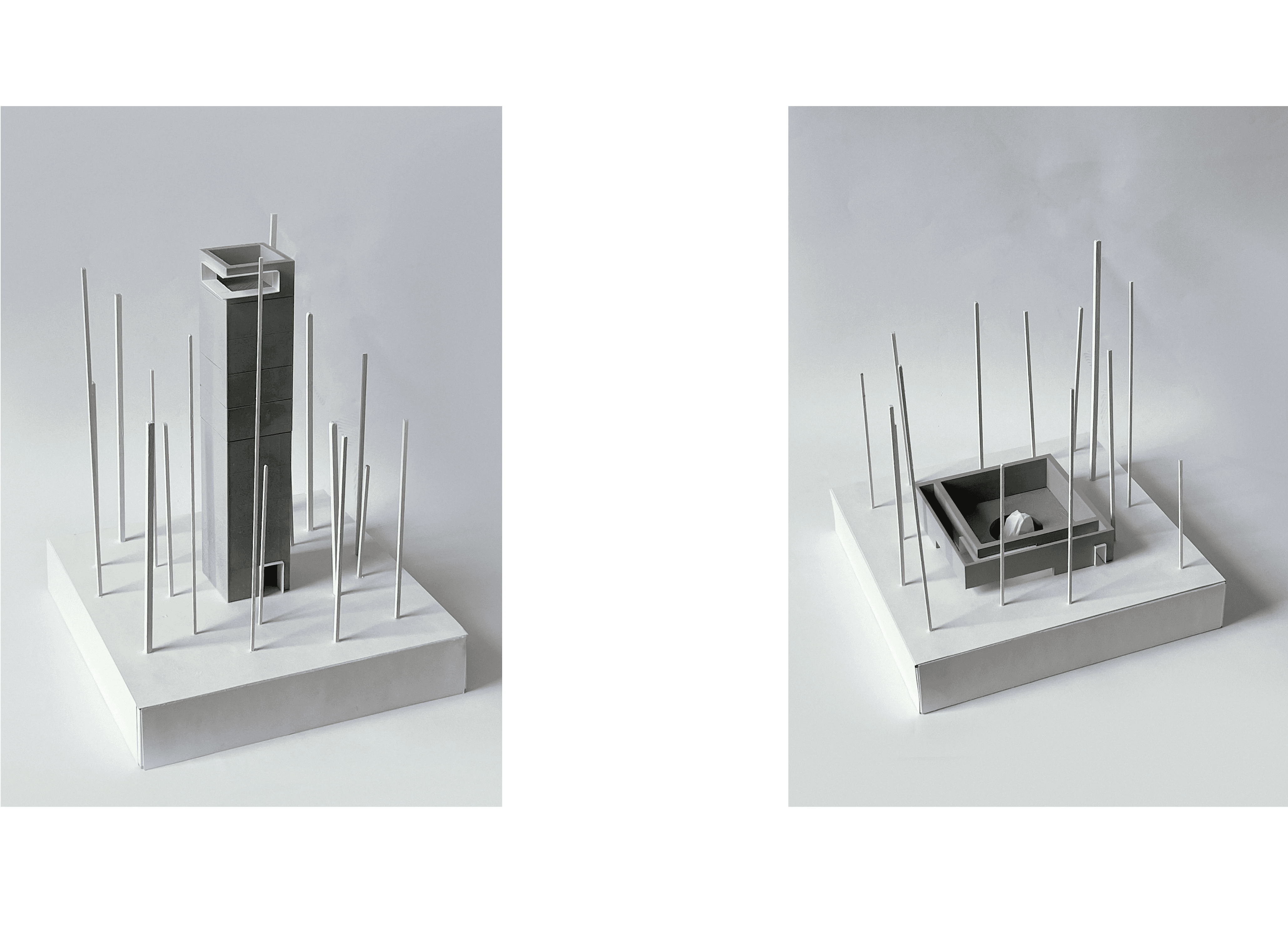 The monuments are dedicated to the three main principles of our environment: air, land, and water. Because of our tendencies to selfishly mistreat and destroy elements of nature for our benefit, each of the three monuments consists of solid, two-foot-thick concrete walls. The paradoxical narrative created by designing monuments dedicated to nature that act as a blank canvas yet still use unnatural materials serves to show that we have still not found a way to design architecture that can resiliently and responsibly withstand nature’s forces while still using materials occurring naturally in our environment. Inside the project’s only ‘building’ sits a cantilevered gallery of some of nature’s most beautiful objects—each of which is behind glass or rope. This furthers the idea that the only time you can truly appreciate nature is when you are outside, not when it is curated.