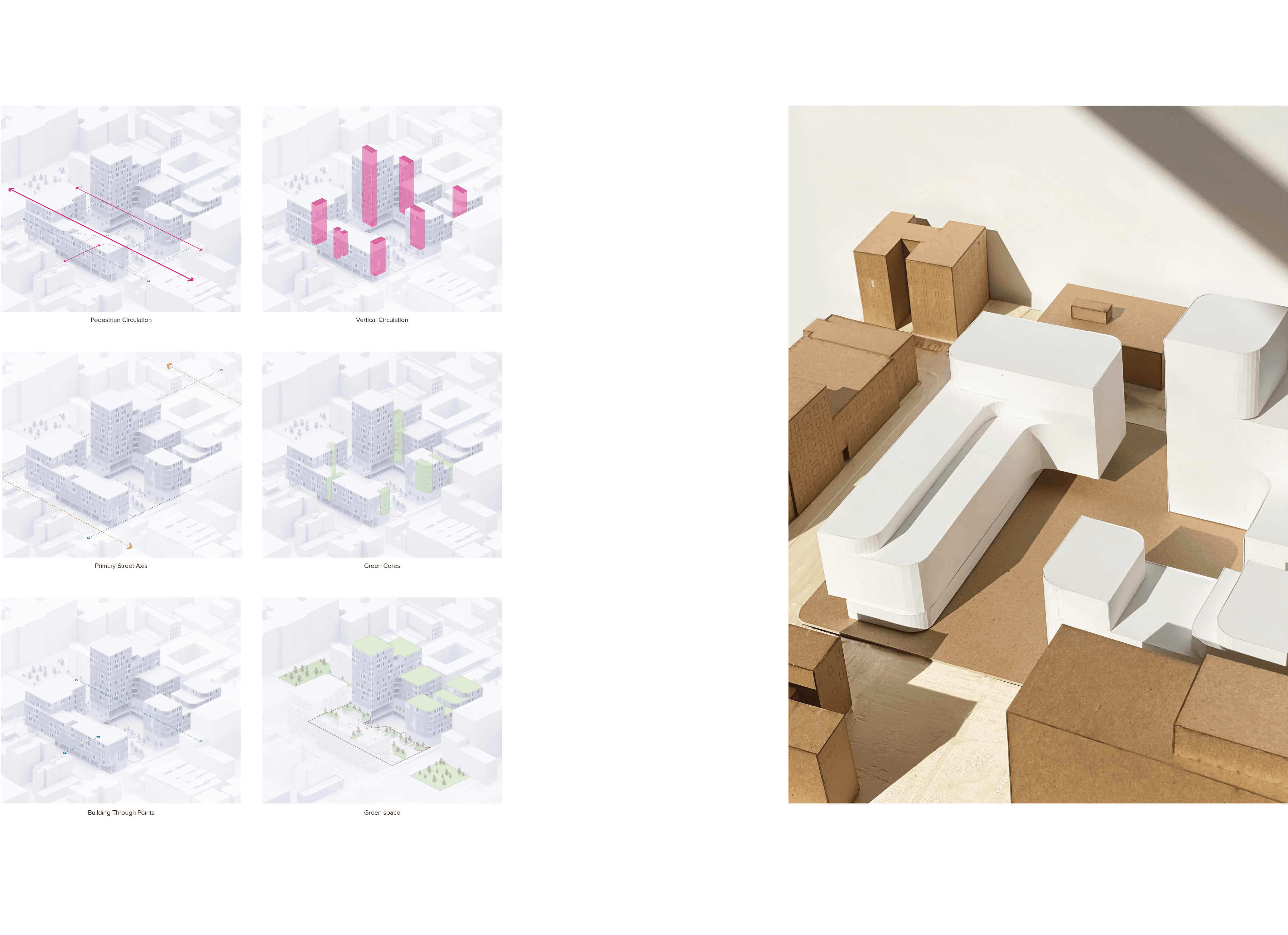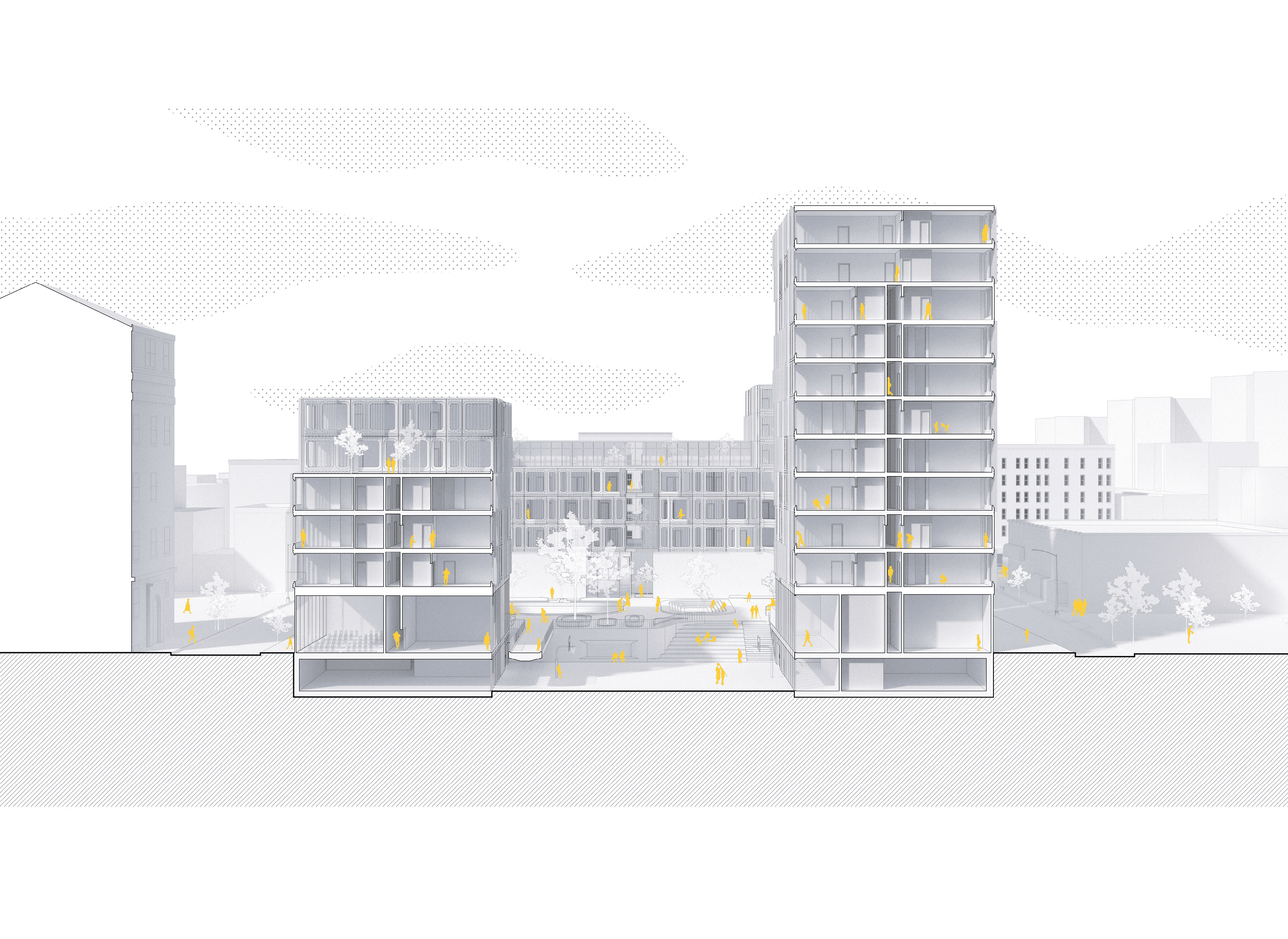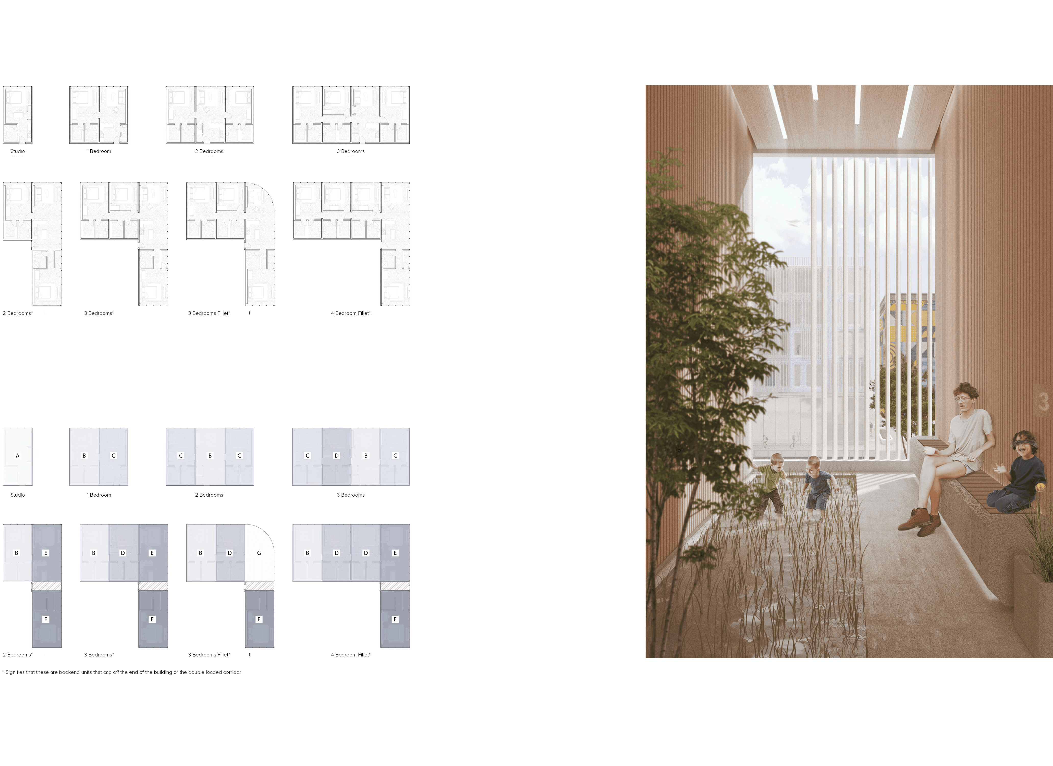 Centered on implementing flexible living solutions to a stagnant housing system, Modular Living aims to provide spaces that adapt to the cycles of life at various scales: day to day, month to month, and decade to decade. Challenge: How can we lower vacancy rates for project managers on the client side, and how can we reduce housing costs? Approach: After visiting the site and conducting user surveys in the neighborhood, we positioned the project to address the commercial thoroughfare on Courtlandt Avenue and the existing green spaces to the north and south. This created circulation flows and massing that optimized sunlight for public spaces while meeting existing zoning requirements for height and setbacks in the commercial section. The architecture itself was constrained by transportation requirements. Building from the smallest module at 14 feet wide and 27 feet long, units could be transported on two twin 27-foot trailers, making navigation through cities and beyond possible. Utilizing this system allowed us to view the site through a modular grid and evaluate which elements of the site worked with the module and which didn't. We addressed irregularities through shared spaces and bespoke conditions that connected the building to the ground. Outcome: We created a series of spaces and modules that solved user needs, providing homes that could grow and evolve with families. This kept vacancy rates lower by retaining valued residents who might otherwise leave due to space constraints. Creating units that could be reprogrammed through partitions and on-site adjustments meant spaces could expand as families grew. While tackling both challenges, we reduced unit costs and incorporated site-specific contexts to create valuable public spaces throughout the building. We also developed a kit of facade parts that could be modified to create varied building gestures and break up the monotony of glass high-rises. Ultimately, we designed an architecturally significant form of housing that addressed the needs of the community in the Bronx and beyond.
