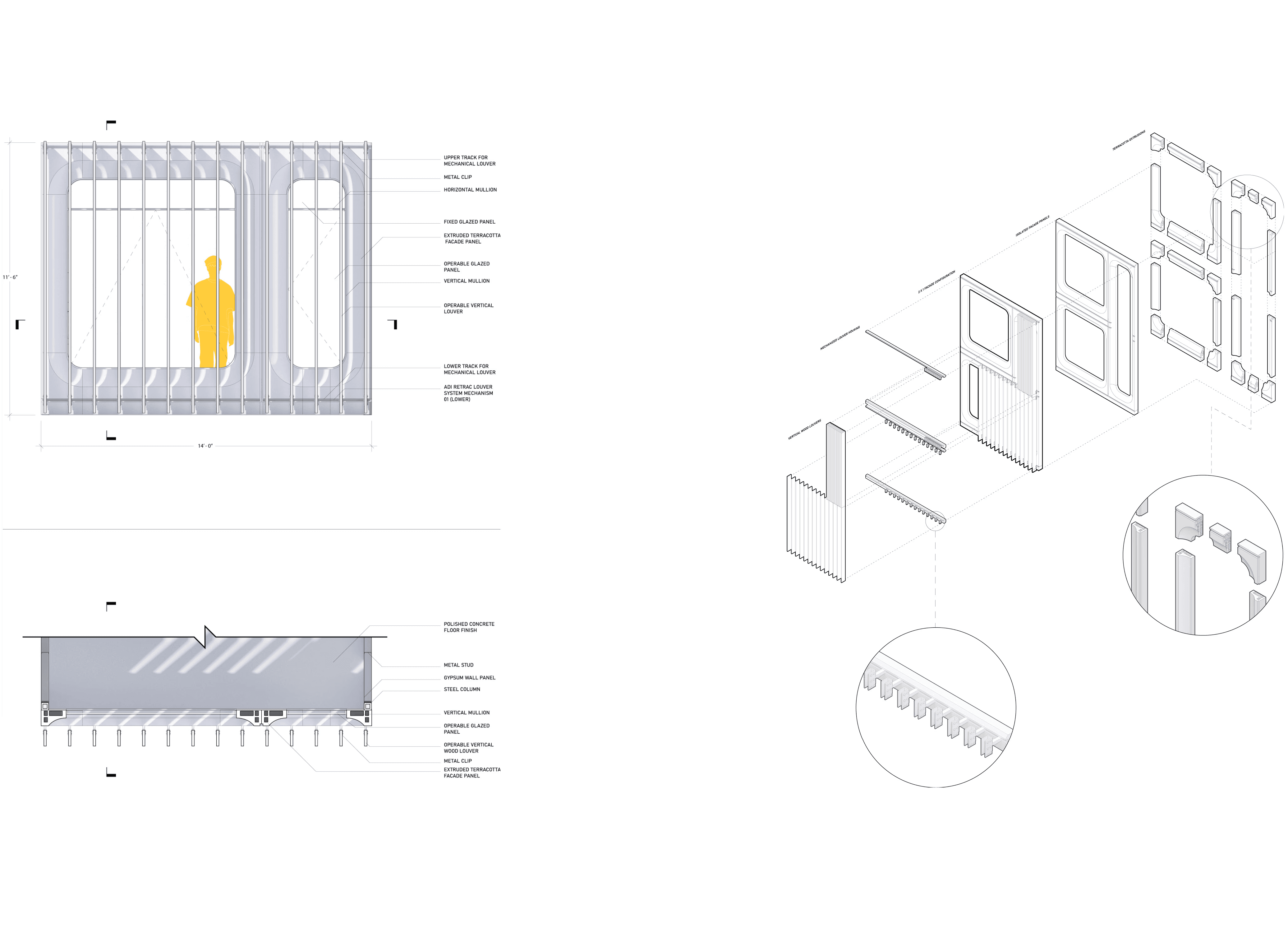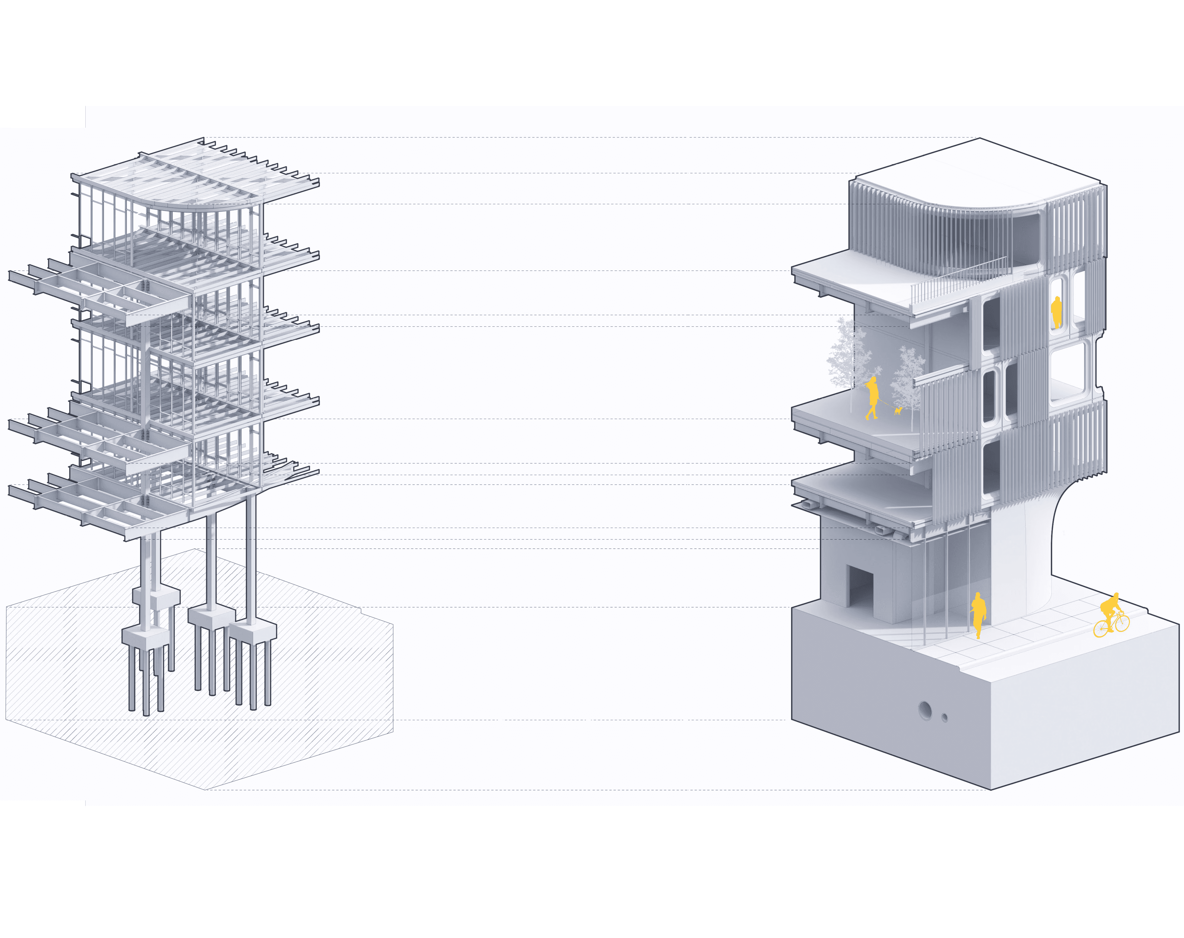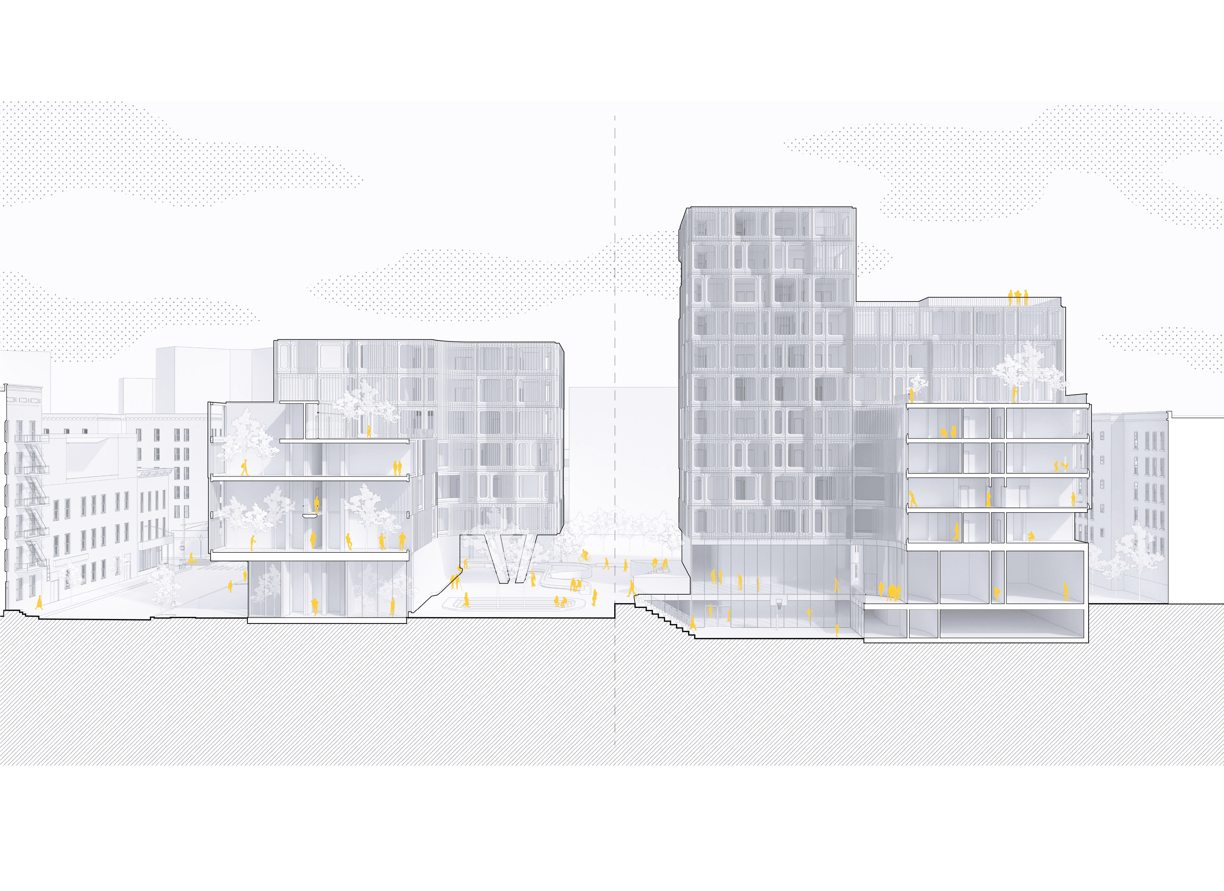 Centered on implementing flexible living solutions to a stagnant housing system, Modular Living aims to provide spaces that adapt to the cycles of life at various scales: day to day, month to month, and decade to decade. Challenge: How can we lower vacancy rates for project managers on the client side, and how can we reduce housing costs? Approach: After visiting the site and conducting user surveys in the neighborhood, we positioned the project to address the commercial thoroughfare on Courtlandt Avenue and the existing green spaces to the north and south. This created circulation flows and massing that optimized sunlight for public spaces while meeting existing zoning requirements for height and setbacks in the commercial section. The architecture itself was constrained by transportation requirements. Building from the smallest module at 14 feet wide and 27 feet long, units could be transported on two twin 27-foot trailers, making navigation through cities and beyond possible. Utilizing this system allowed us to view the site through a modular grid and evaluate which elements of the site worked with the module and which didn't. We addressed irregularities through shared spaces and bespoke conditions that connected the building to the ground. Outcome: We created a series of spaces and modules that solved user needs, providing homes that could grow and evolve with families. This kept vacancy rates lower by retaining valued residents who might otherwise leave due to space constraints. Creating units that could be reprogrammed through partitions and on-site adjustments meant spaces could expand as families grew. While tackling both challenges, we reduced unit costs and incorporated site-specific contexts to create valuable public spaces throughout the building. We also developed a kit of facade parts that could be modified to create varied building gestures and break up the monotony of glass high-rises. Ultimately, we designed an architecturally significant form of housing that addressed the needs of the community in the Bronx and beyond.