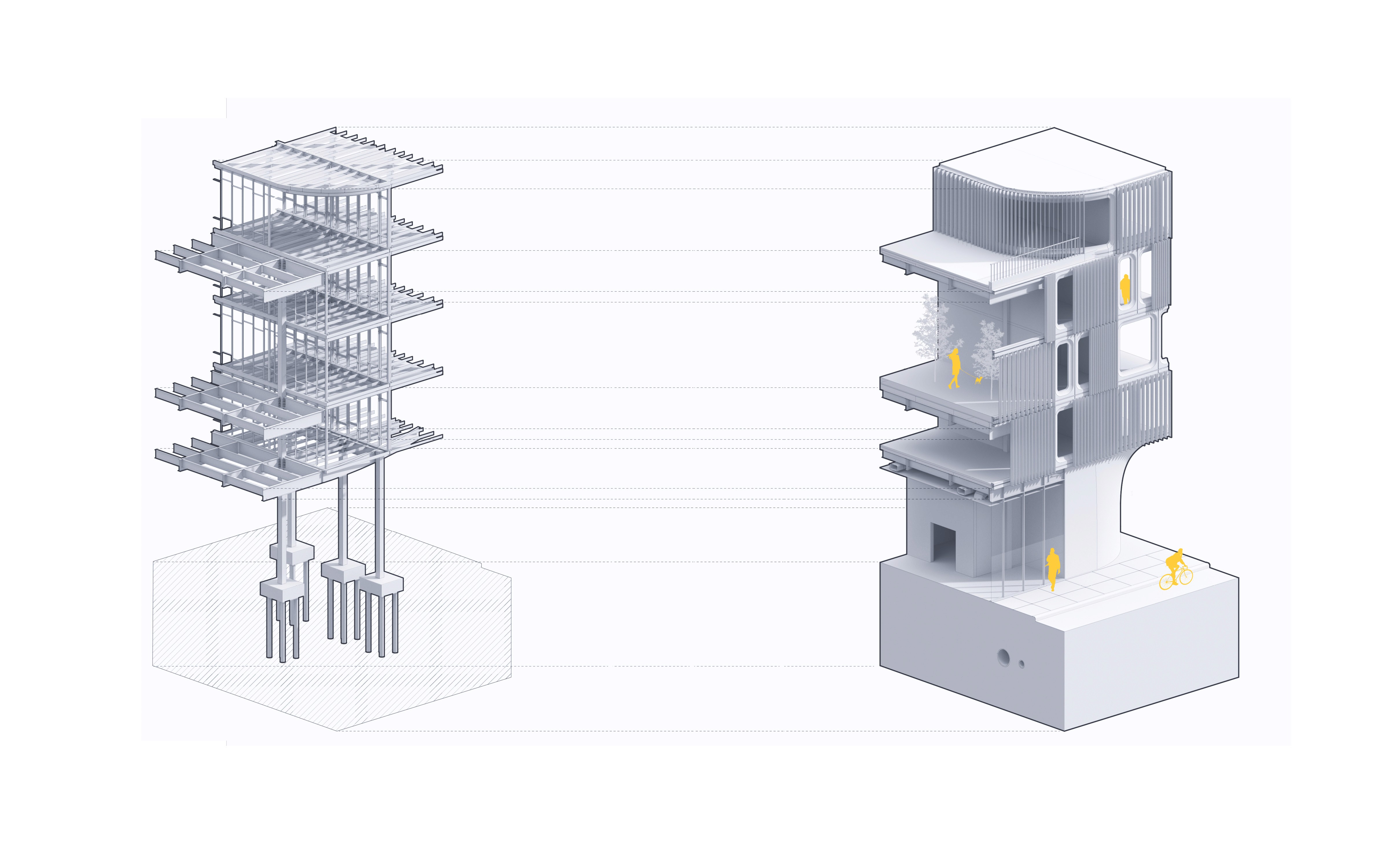 Centered on the concept of implementing flexible living solutions to a stagnant and rigid housing system, Modular Living aims to provide a space that can adapt to the changes and flows of the cycles of life at various scales—from day to day, month to month, and decade to decade.