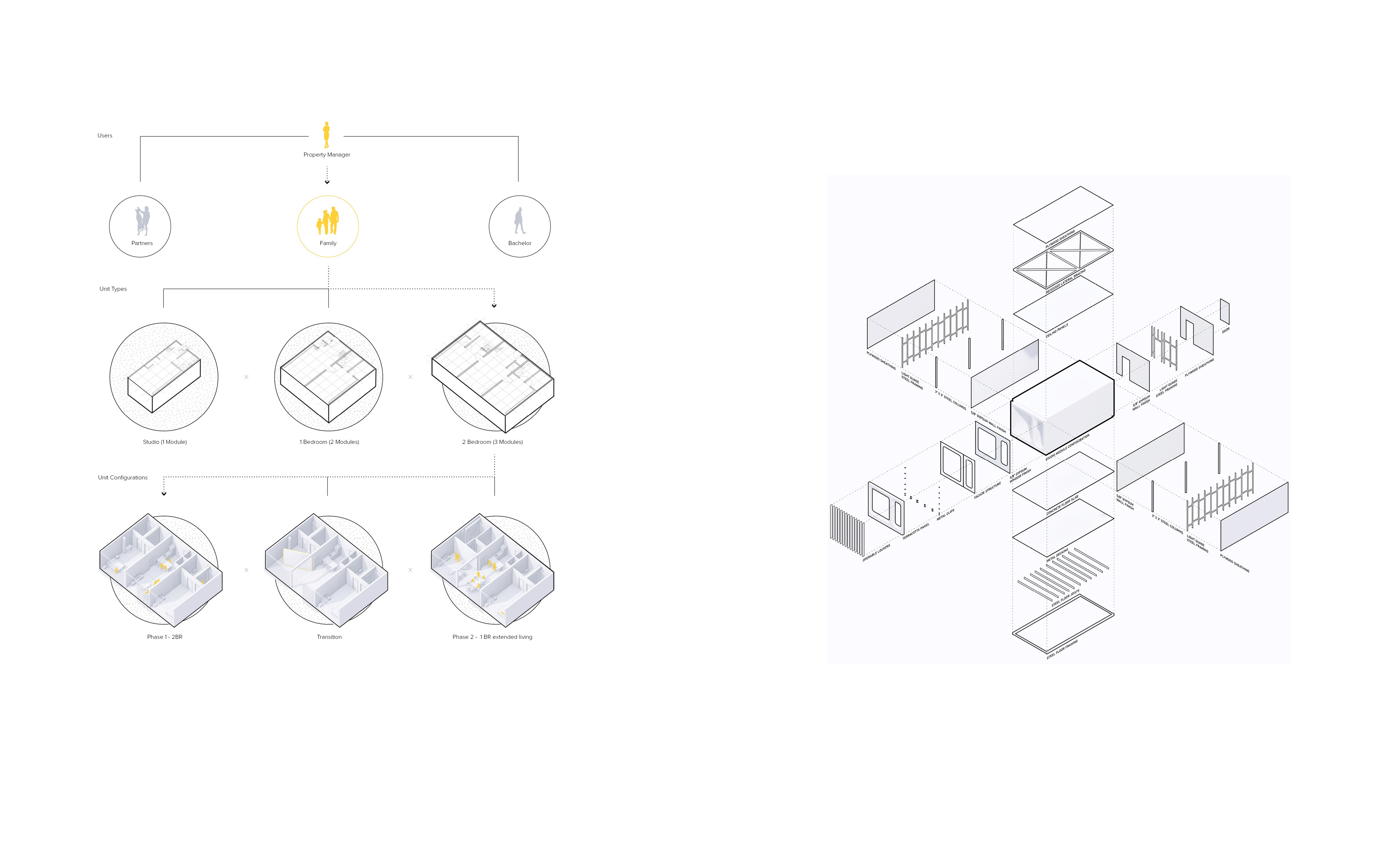 In an effort to undercut the traditional manufacturing costs of housing and reduce vacancy rates, this flexible modular system can adapt to the everyday desires of our occupants while maintaining low levels of variance within prefabricated elements and reducing redundancy when combined with site-specific architectural moments.