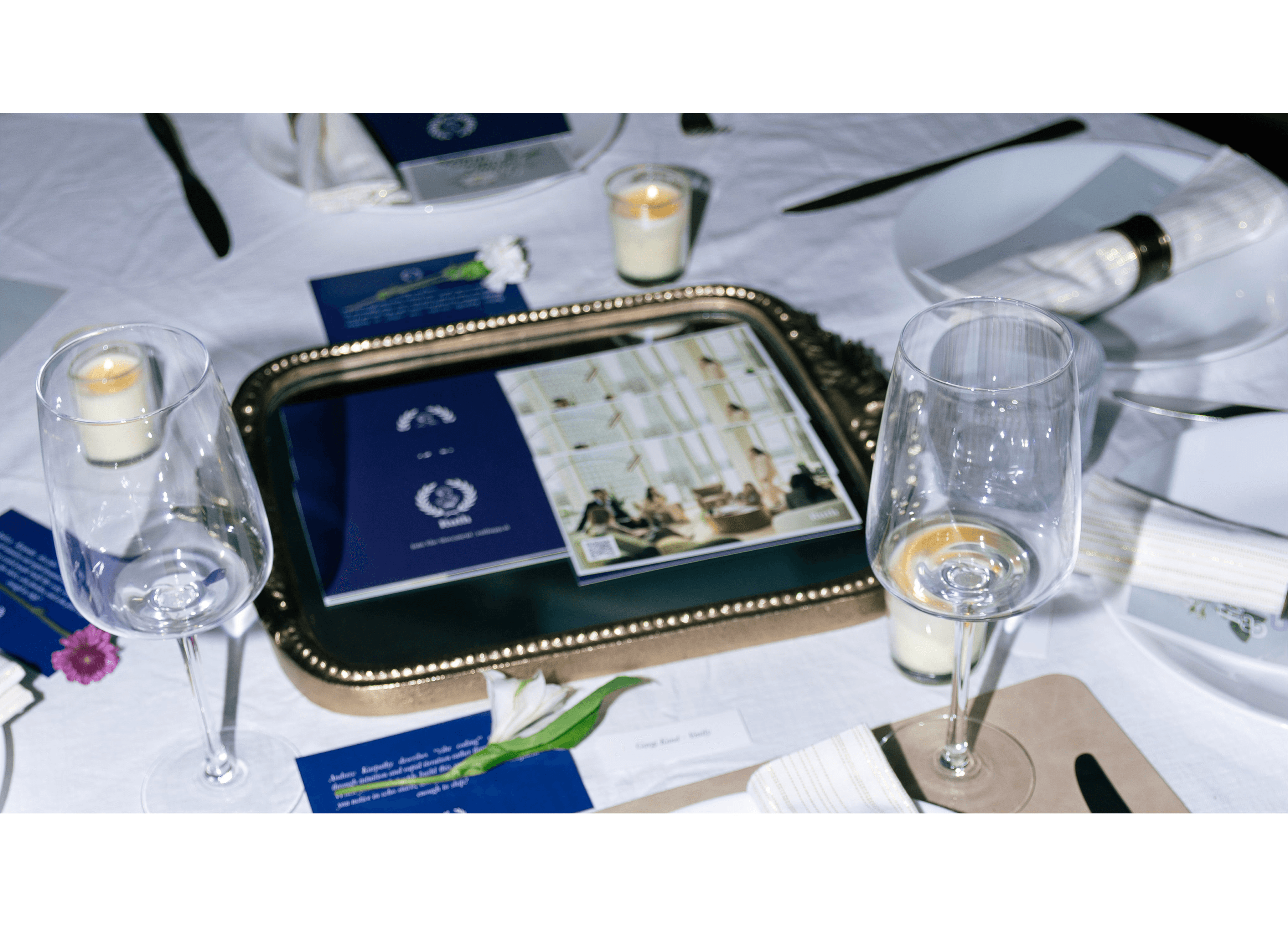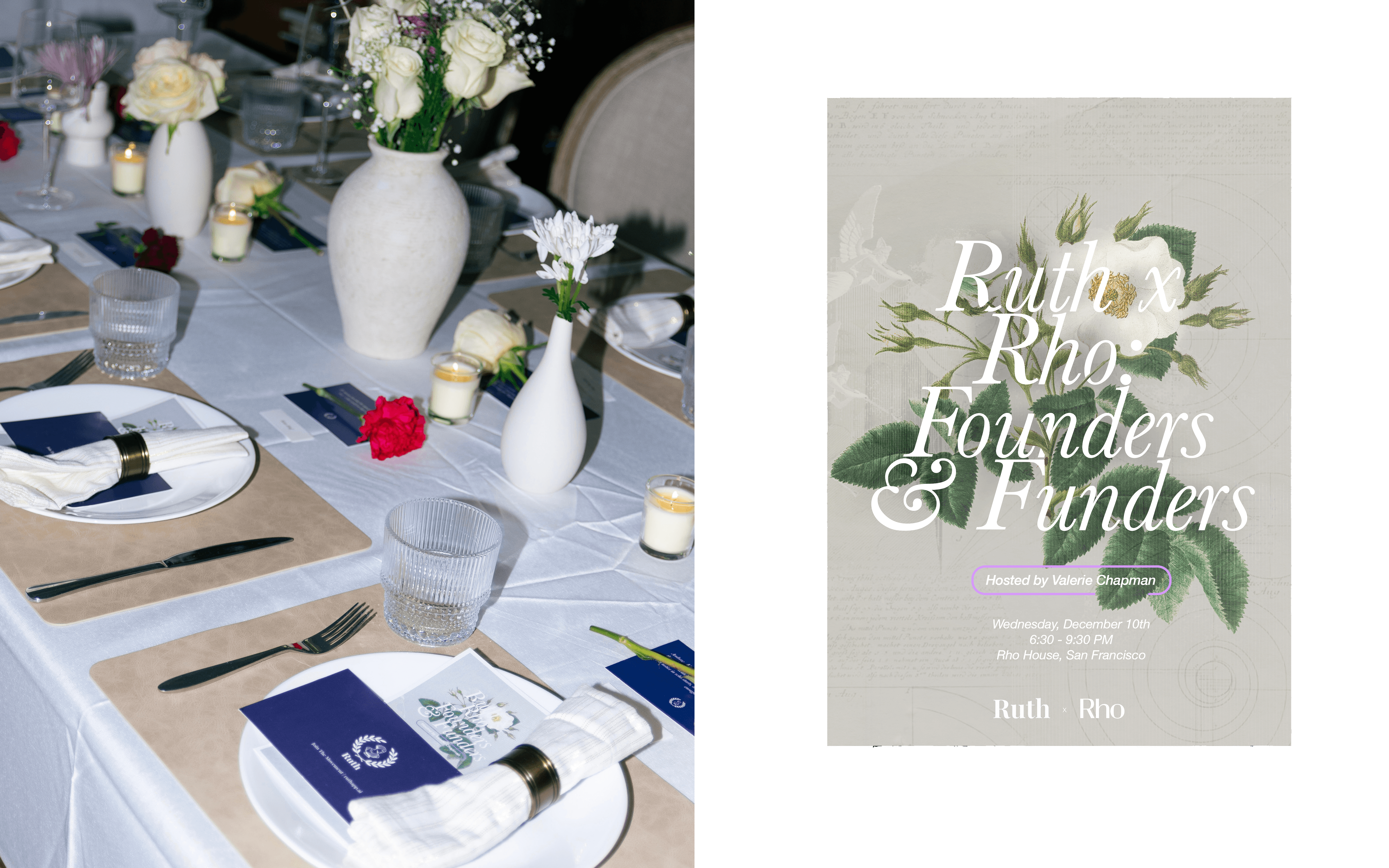 Operating in the startup space, things move rapidly. When Ruth.AI's founders asked me to serve as Creative Director for an intimate dinner happening in less than 48 hours, I was interested but concerned about feasibility. In the end, it came together and everything felt right. Challenge: Delivering a fully realized brand experience for a space we'd never seen. We had no advance knowledge of the room's size, existing furniture, or conditions. The challenge was aligning Ruth's identity with Rho's existing space while working within these unknown constraints and an extremely tight timeline. Approach: I worked closely with Ruth's founders to identify what we could truly control and make our own. Beyond creating an identity that aligned with the brand's guidelines, I strategically designed visual solutions to mask areas and finishes that were too busy or distracting. The goal was to remove visual noise while layering in elements of Ruth's identity, establishing a clear distinction between what represented Ruth and what belonged to Rho's existing space. Outcome: The printed collateral brought intentionality to the experience. Combined with our floral strategy, every dinner guest was made to feel special. We transformed a purely functional space into a curated dining experience. The masking elements created connection and unity across different touchpoints: the bar, dining table, walls, and coffee table. Through deliberate use of light materials and lighting, we connected the living room and dining room into a cohesive experience, one that brought together those with ideas and those with capital. What I Created: - Custom printed collateral and table materials that reinforced Ruth's identity - Floral strategy and placement that created moments of intimacy - Visual masking elements (materials, lighting, strategic placement) that unified disparate spaces - Environmental graphics that distinguished Ruth's brand from Rho's existing aesthetic - Lighting design that connected living and dining areas into cohesive experience "Last week, Ruth AI Inc. partnered with Rho to host a Founders & Funders dinner in San Francisco celebrating the women building the future of tech. The room was filled with incredible funders, founders, and creators I believe are the next wave of founders. The conversation went deep: What vibe coding means for women builders, Why creators deserve more venture capital, How we close the AI gender gap, What's next for female founders, How AI can drive social good, Why when women earn what they're worth, everyone benefits." - Valerie Chapman, Founder of Ruth.